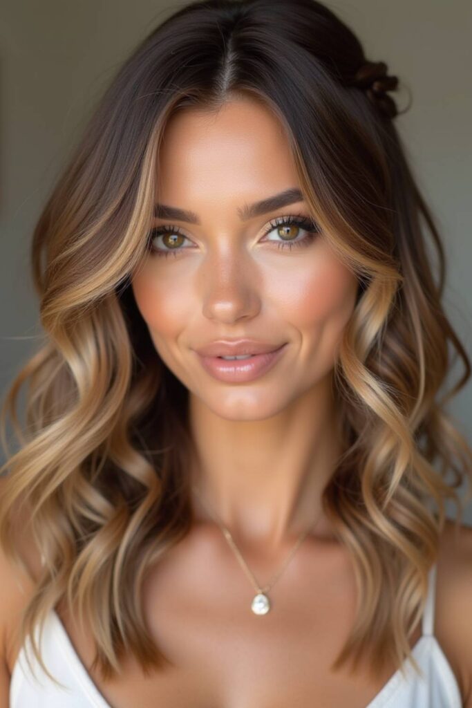 The half-up style lets you add fun embellishments like hairpins or flowers. The waves softly frame your face, making it a lovely choice for strapless or sweetheart dresses.