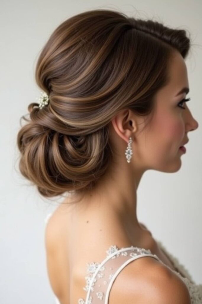 Enhance the look with a delicate headpiece, like a jeweled headband or vintage clip, for an elegant bridal finish.