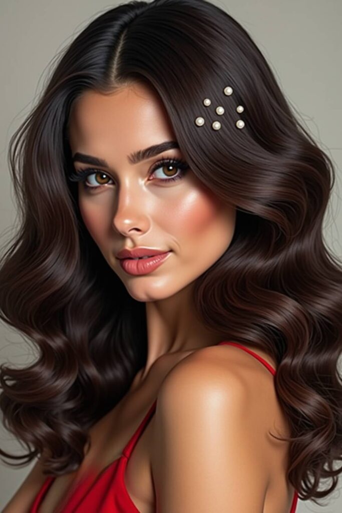 To add a magical touch, pearls are gently placed throughout the waves, giving your hair a dreamy, timeless look. This hairstyle is perfect if you love a regal yet modern vibe.
