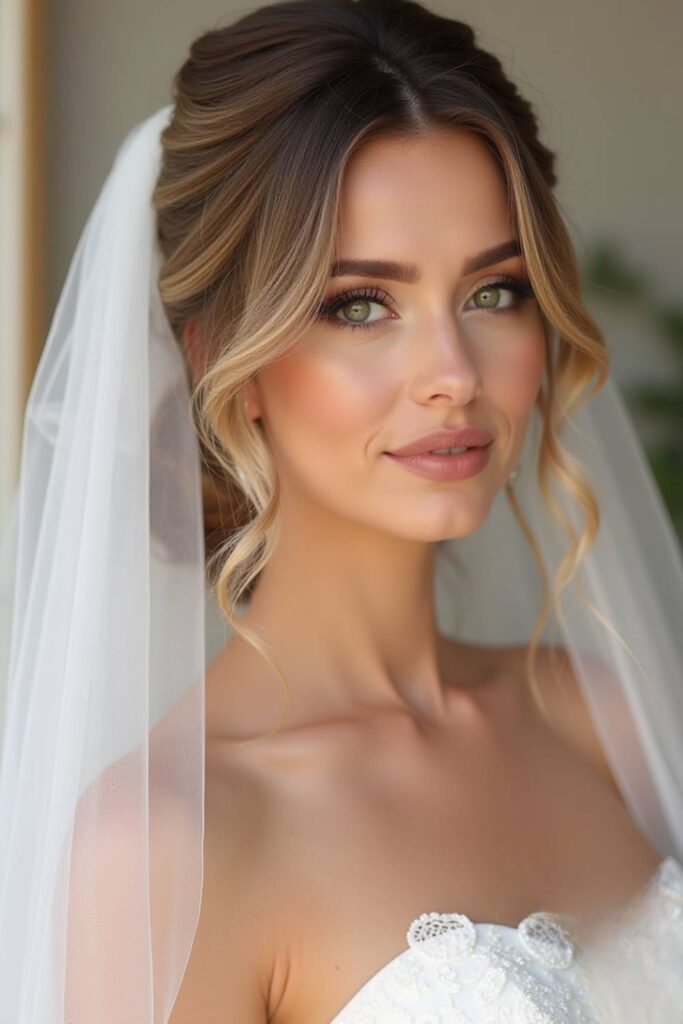 The lightweight veil sits perfectly without disturbing the waves, letting you take it off easily later. This look suits any wedding theme, from formal church settings to garden ceremonies.