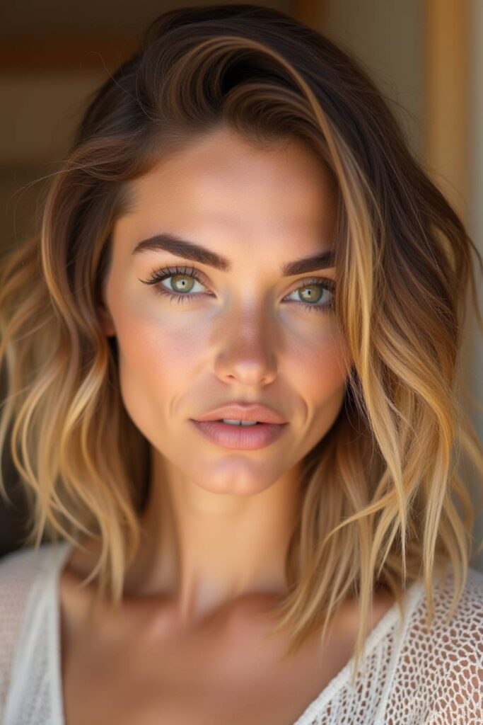 Use a curling wand to create soft, tousled curls, and gently brush them out for a natural texture. A light texturizing spray at the roots adds a bit of lift, maintaining an easygoing vibe.