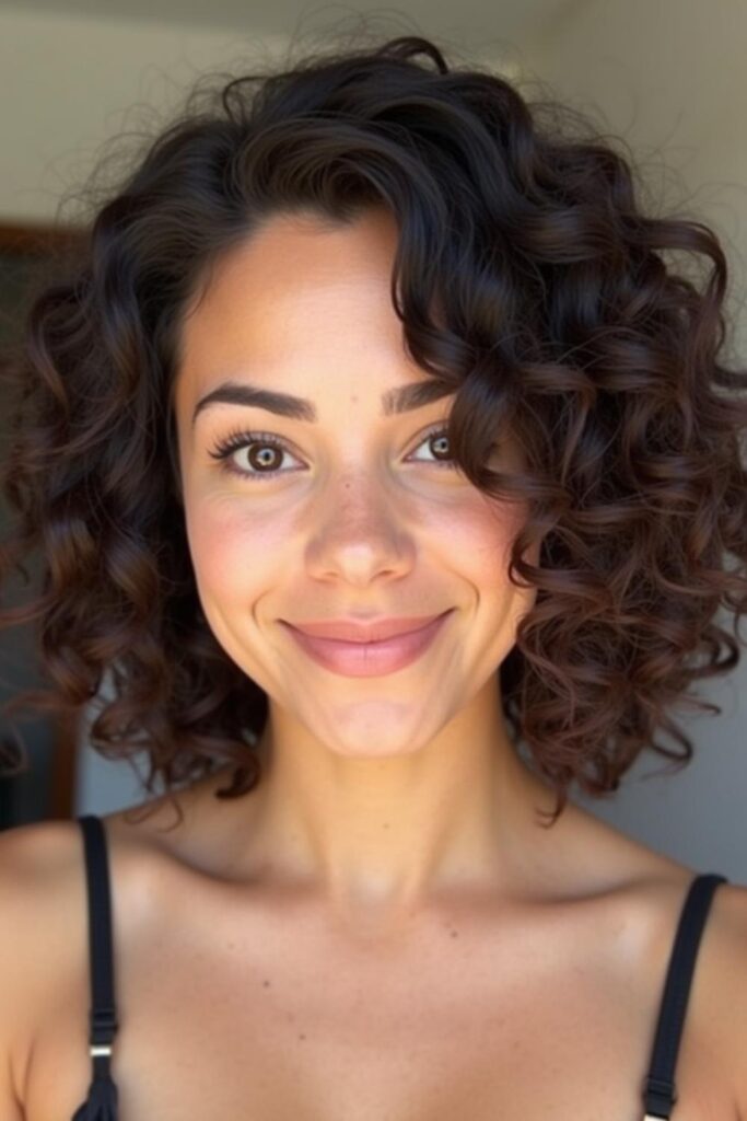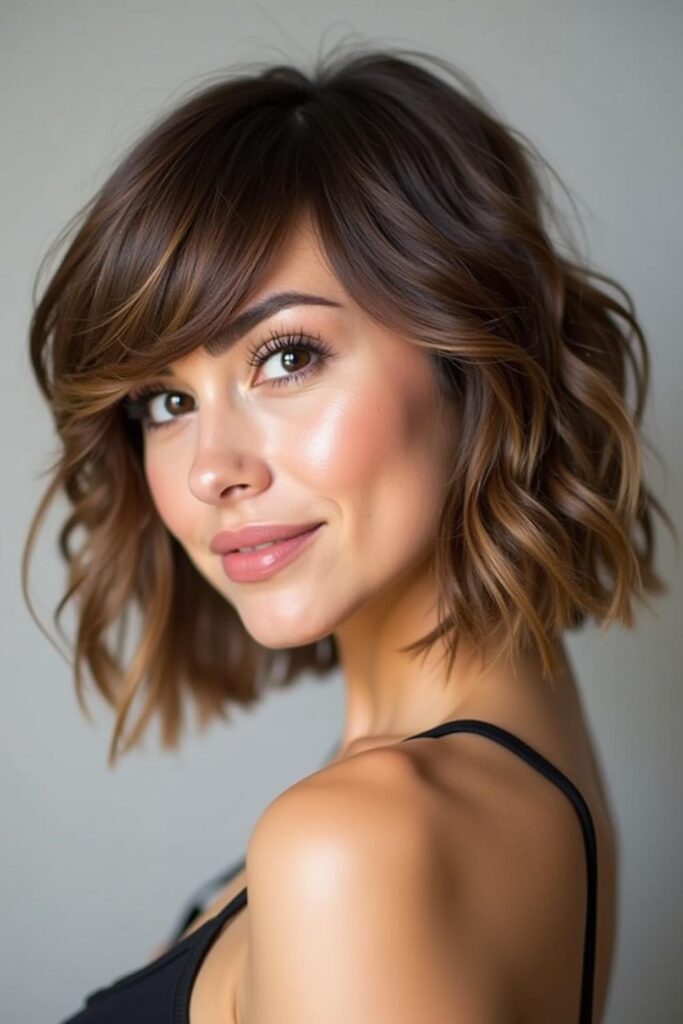 Add charm and texture with the Curly Bob with Bangs, a style that’s playful yet graceful.