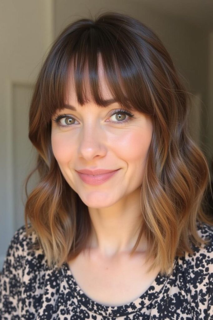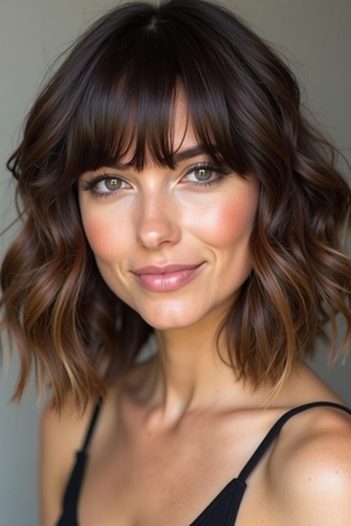 Achieve a playful yet elegant look with Textured Waves with Bangs. The soft bangs reduce forehead visibility, while tousled waves add volume and texture.