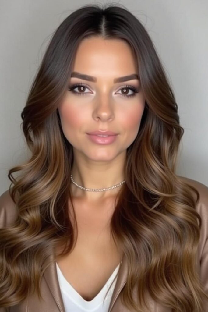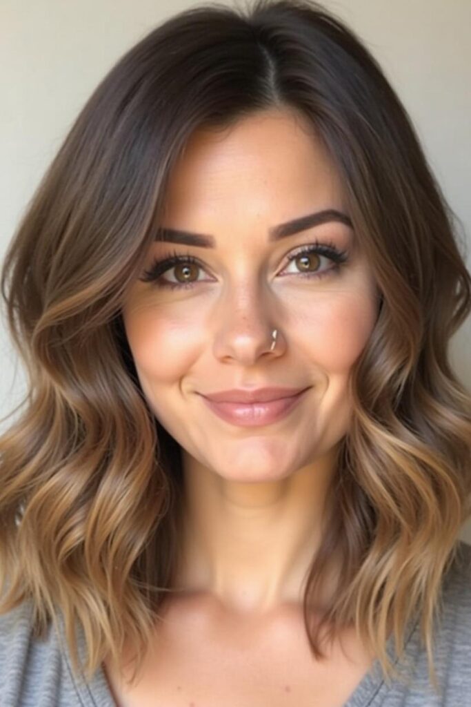 For a stunning, slimming effect, choose Soft Balayage Waves. The mix of darker roots and lighter ends draws the eye vertically, visually elongating your face.
