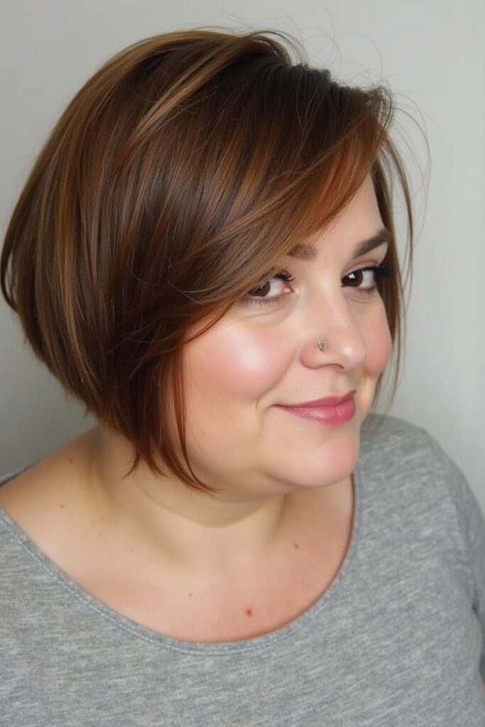 The Sleek Angled Bob stands out with sharp, angular cuts that elegantly draw attention away from facial roundness.