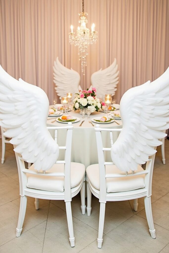 Elevate your seating arrangements with Angel Wing Chairs. Wrap chairs in flowing fabrics, shaped like angel wings, using white or pastel hues.