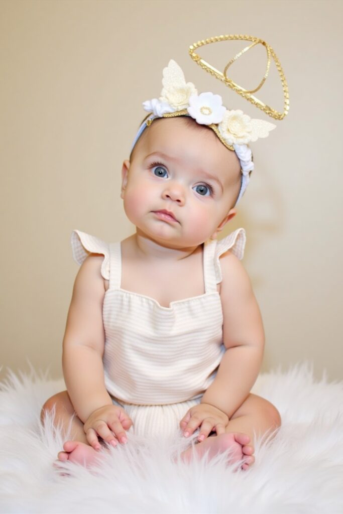 Set up a backdrop featuring elegant angel wings and add ethereal props like halos, feather boas, and golden accents.