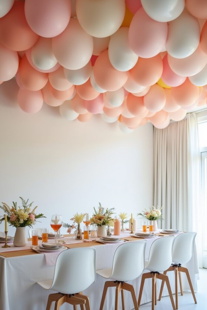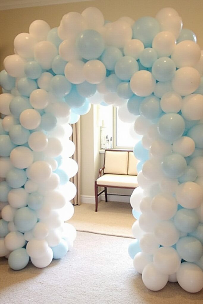 Transform your ceiling into a peaceful sky with balloons in soft white, shimmering silver, and pale blue hues.