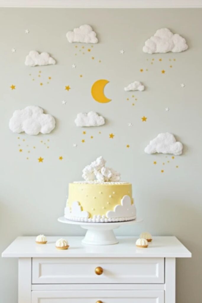 Create a dreamy celestial ambiance with fluffy cloud installations floating above and shimmering star-shaped lights casting a magical glow.
