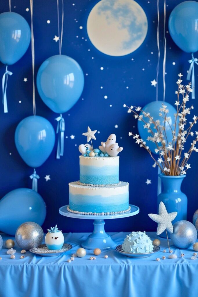 Transform your baby shower into a dreamy celestial escape with midnight blue backdrops that mimic the night sky.