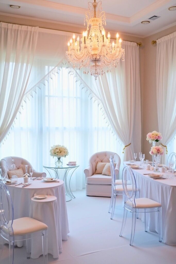 Opt for transparent chairs, vases, and plates paired with silver or white table settings. Adorn the space with faux crystal chandeliers or hanging prisms that catch the light beautifully.
