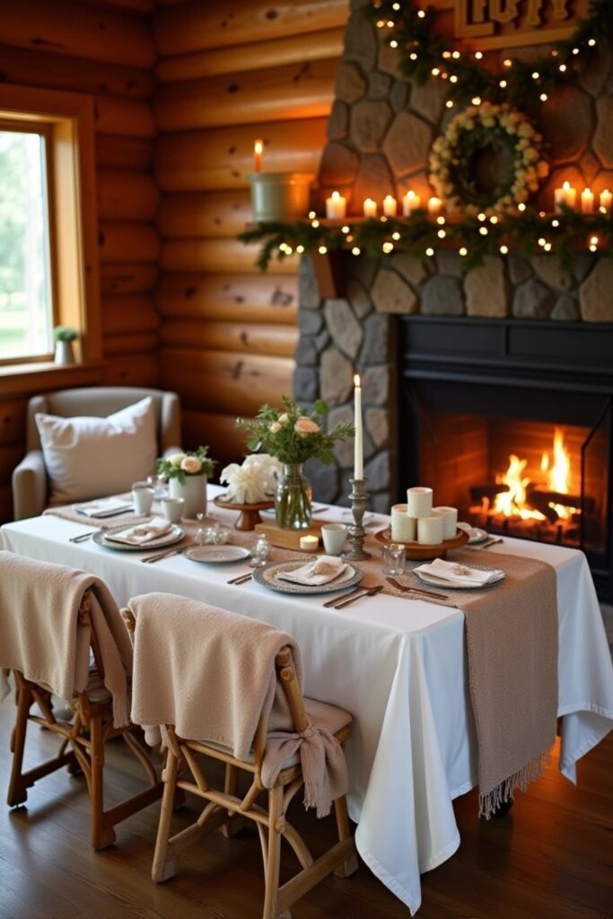 Add candles in moss-covered holders and wooden details for a cozy forest vibe. Your guests will feel as though they’ve stepped into a charming wintry woodland.