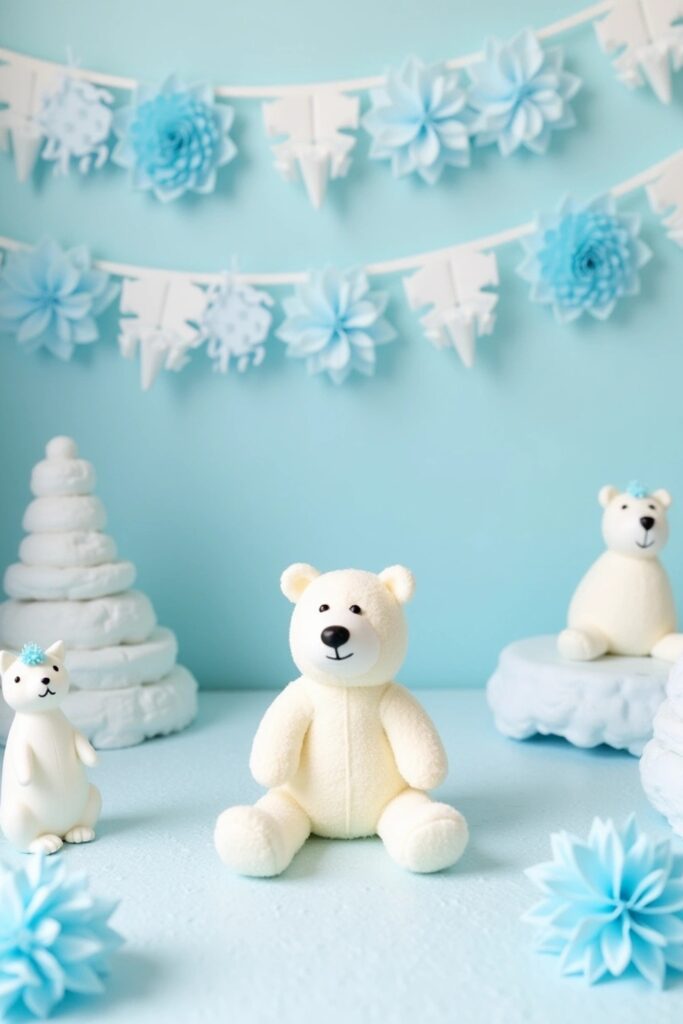 Transform your baby shower into a peaceful winter wonderland with soft, snowy hues. Use white and pale blue decorations to simulate a gentle snowfall.