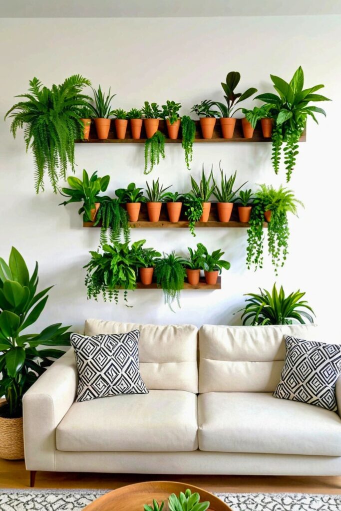 Infuse your living room with nature’s charm by incorporating wall-mounted planters above your couch. This clever decor choice introduces a natural touch without occupying floor space.