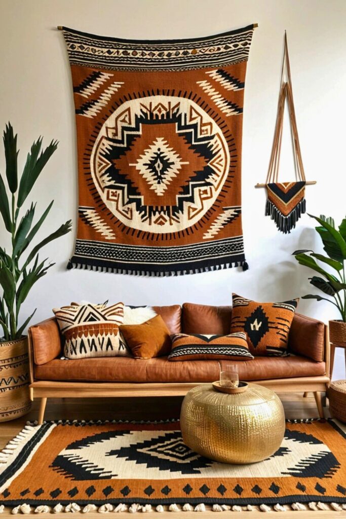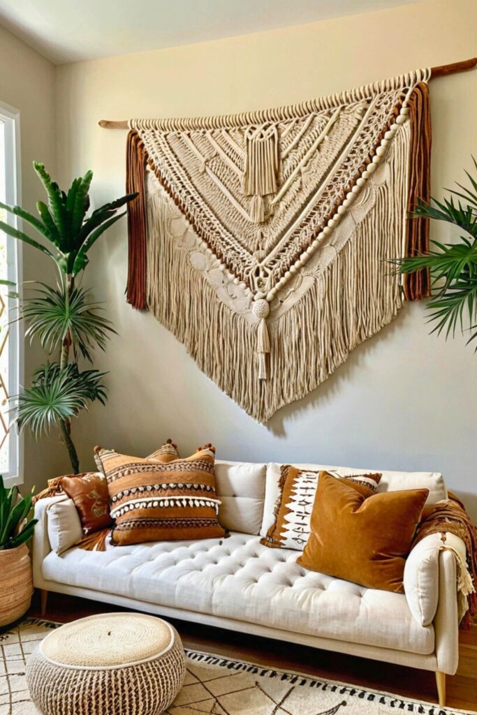 Macramé wall hangings bring a bohemian charm and texture to your living room. Perfectly suited above a couch, they act as a soft visual anchor without overwhelming the space.