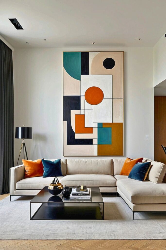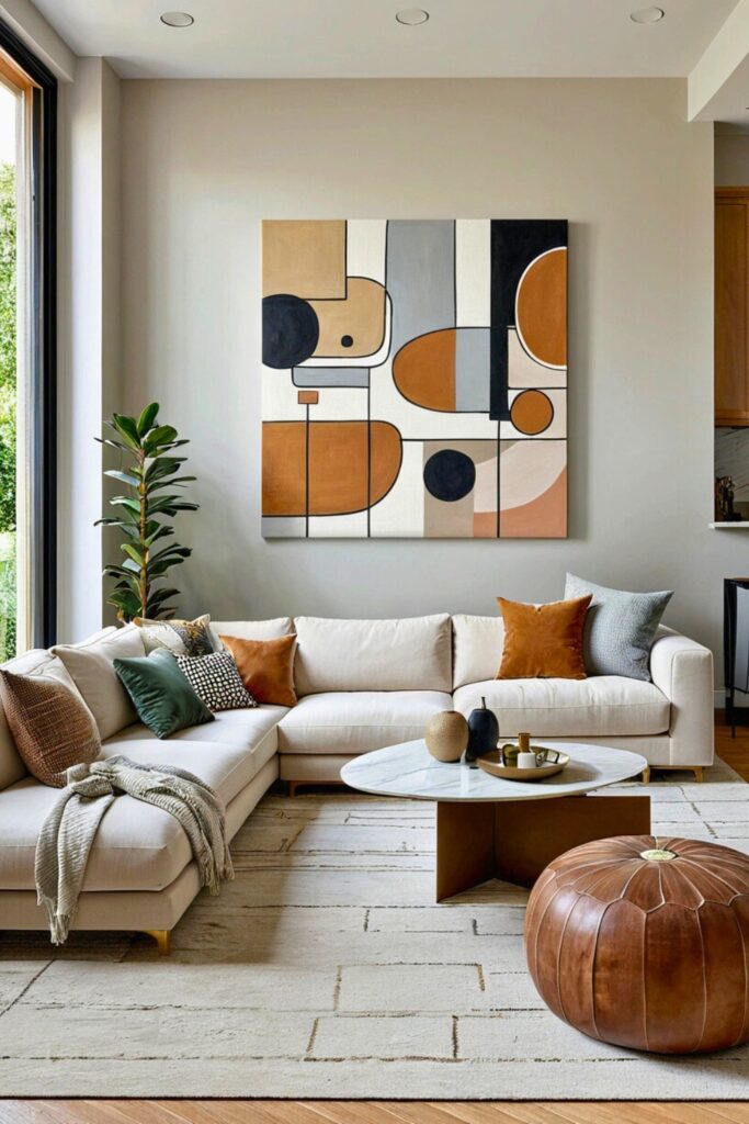 Make a bold impact with a statement art piece above your couch, setting the room’s tone and color scheme. Choose art that complements your furniture or offers a striking contrast.