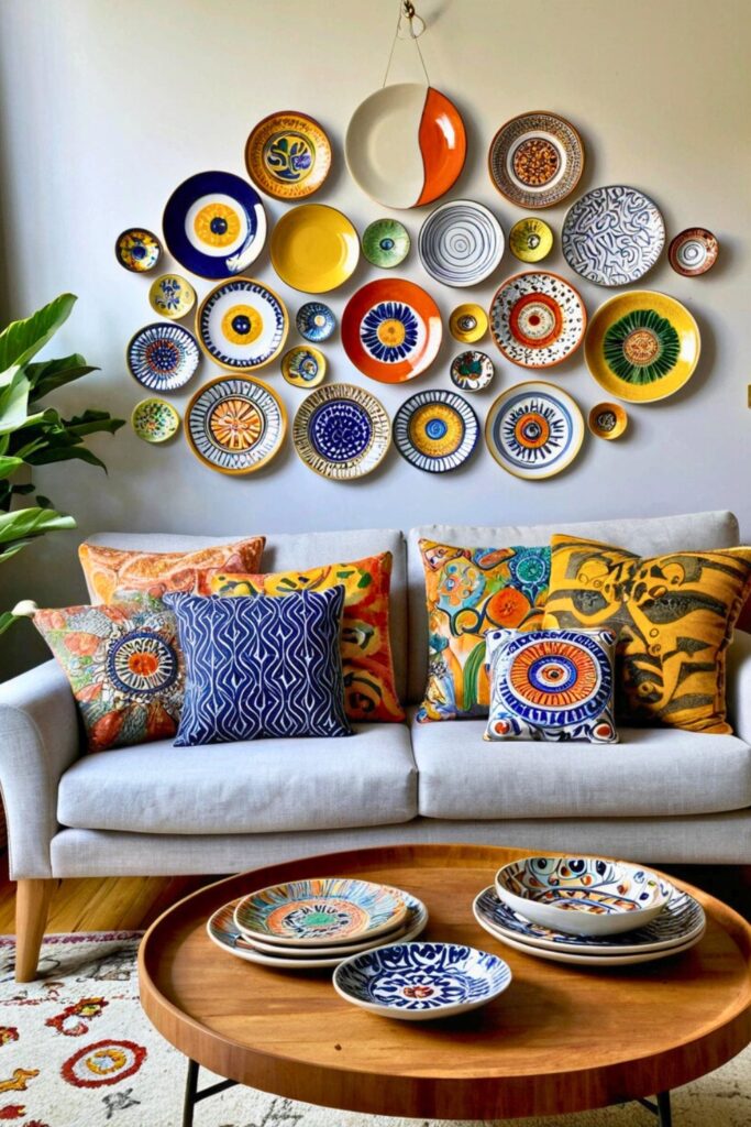 Transform your living room with decorative ceramic plates elegantly arranged above the couch. Choose plates that match your room’s color scheme, like soothing blues for a coastal vibe or warm earthy tones for a bohemian feel.