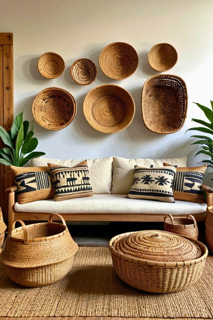 Arranging woven baskets above the couch introduces a unique, earthy texture. Select baskets in different sizes and patterns to add depth and interest, clustering them for a cohesive look.