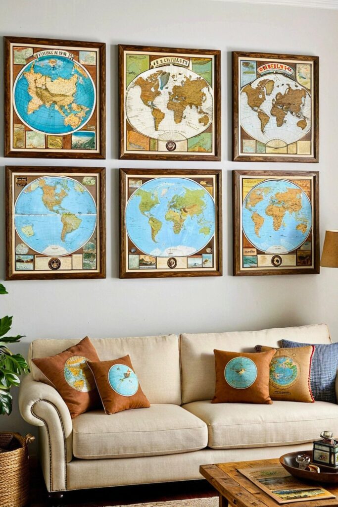 Framed maps or travel-inspired art pieces create a distinctive focal point and infuse your living room with personality.