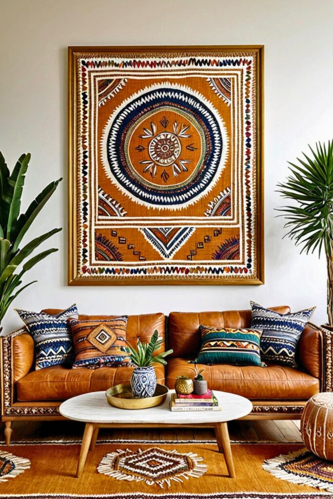 Elevate your living room with a touch of global elegance by framing a textile or tapestry. This artistic option introduces vibrant colors and patterns, instantly transforming your wall into a canvas of creativity.