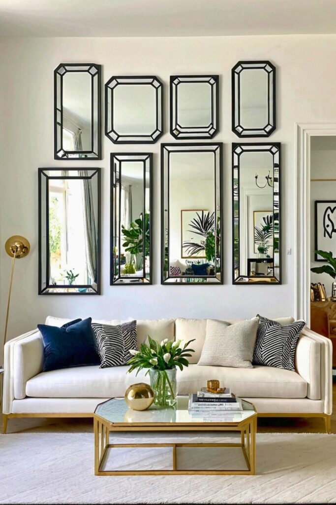 Create an intriguing focal point with layered mirrors above your couch. This stylish approach involves using smaller mirrors of varying shapes and frame materials like gold, wood, or metal.
