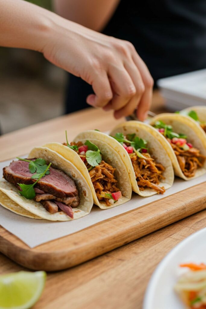 Create a gourmet taco bar featuring thoughtfully plated tacos filled with creative ingredients like duck confit or vegan jackfruit.