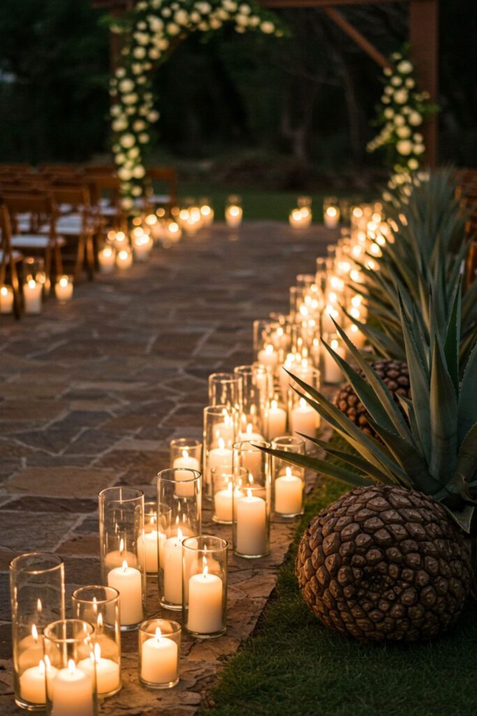 Create a romantic and rustic ambiance with a gorgeous candle-lit aisle lined with agave plants.