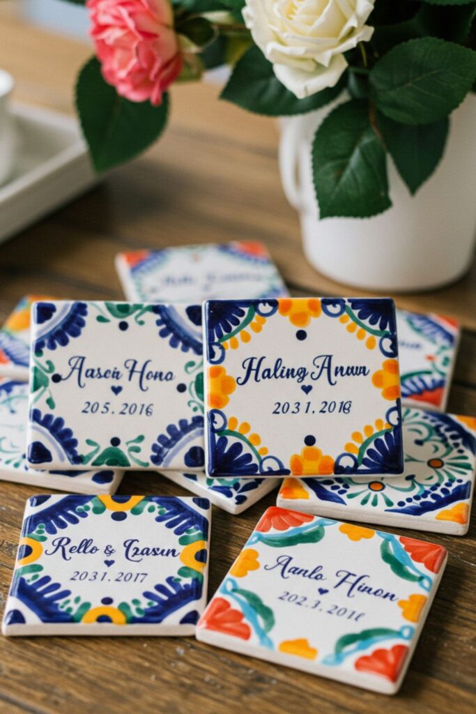 Impress guests with handcrafted Talavera-style tiles personalized with their names, wedding date, or a heartfelt message.