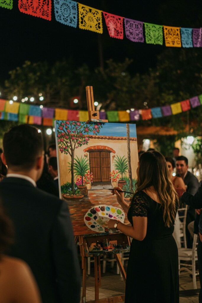Capture your wedding’s magic with a live artist painting a vibrant Mexican-inspired scene in real time.