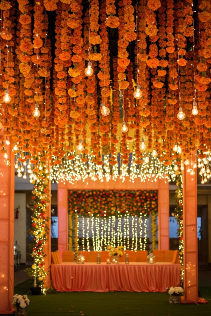 Create a magical, whimsical ambiance with cascading bright marigolds paired with soft, glowing fairy lights.