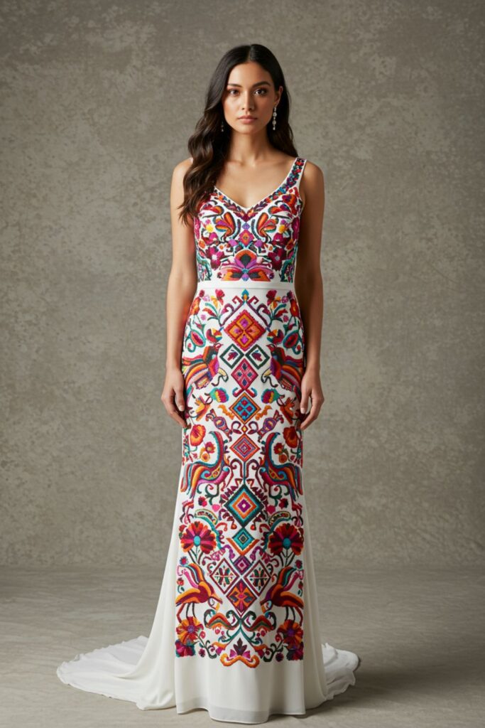 Opt for a fitted silhouette adorned with intricate Otomí or Chiapaneco embroidery.