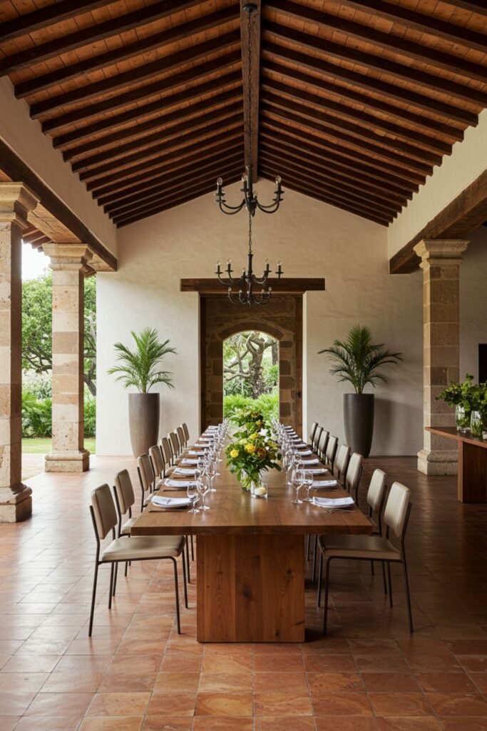 Incorporate touches like metallic details or contemporary light fixtures to elevate the elegance while maintaining the hacienda’s historic warmth.
