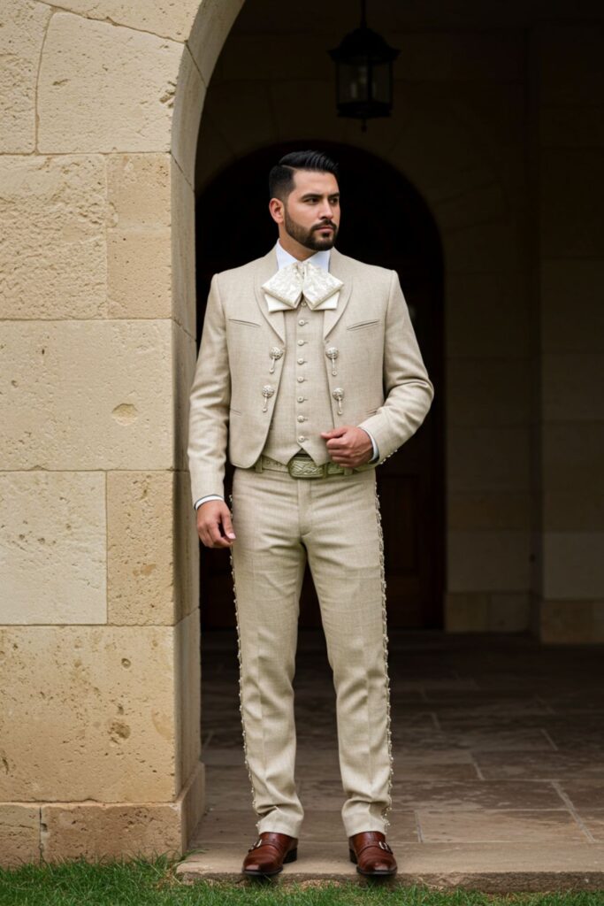 Soft, breathable fabric in neutral tones, paired with sleek embroidery and a refined fit, creates a look that’s both stylish and culturally significant for an unforgettable wedding outfit.