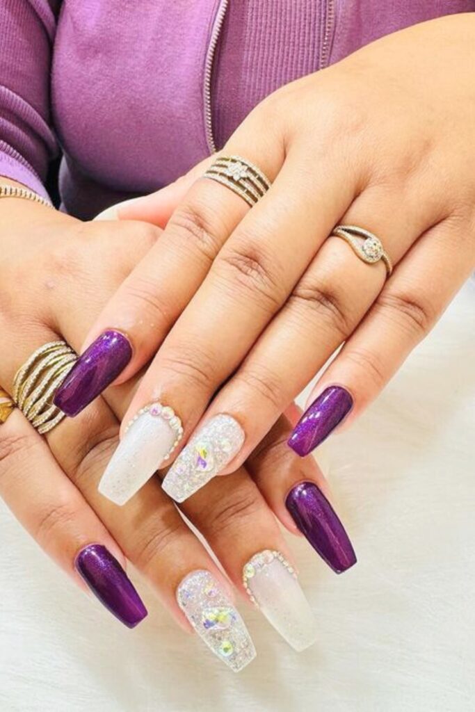 Begin by painting your nails purple, then transition to white polish on select nails, gently blending silver glitter outward for a seamless ombre effect.