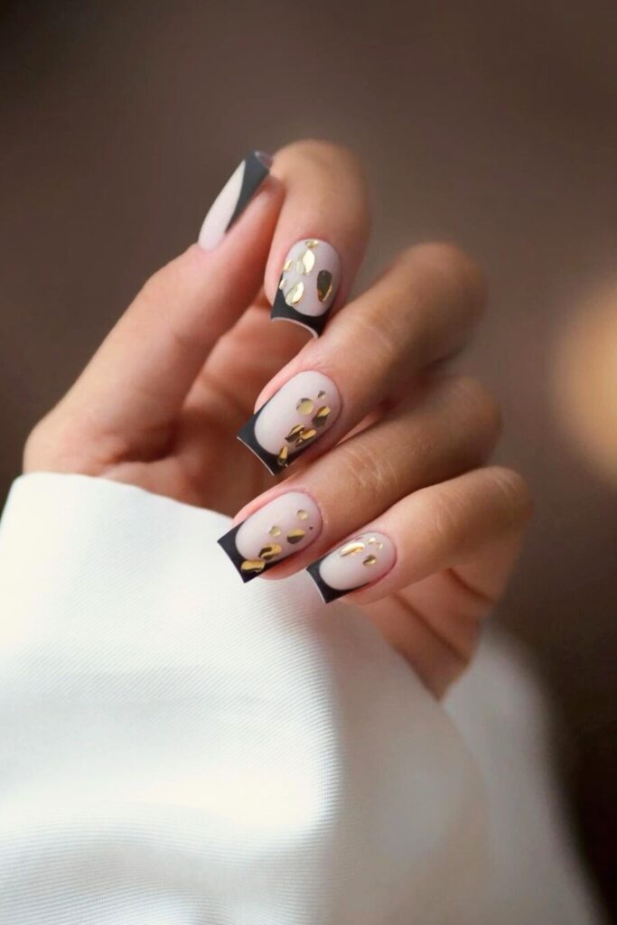 Start by applying a nude polish, then add sleek black tips. Delicately place gold foil pieces and seal the look with a glossy topcoat.