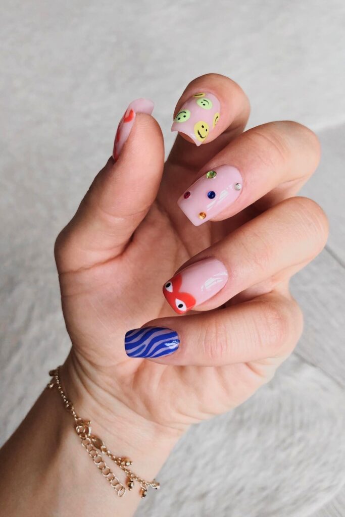 Each nail tells its own story, featuring bright yellow smiley faces, dazzling multicolored gems, a cheerful red heart, and a dynamic blue wave pattern.
