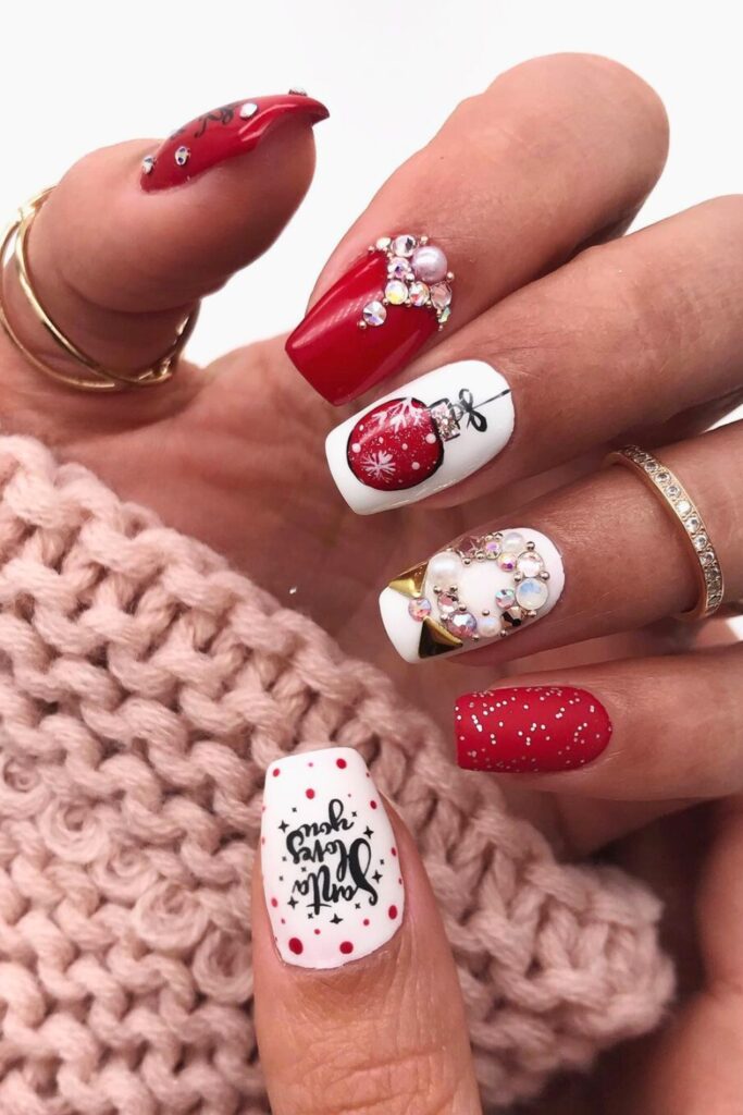 Add pearls and rhinestones to elevate the look with a glamorous twist. To achieve this, start with a red and white base coat, using delicate brushes or stickers to add intricate ornament details.