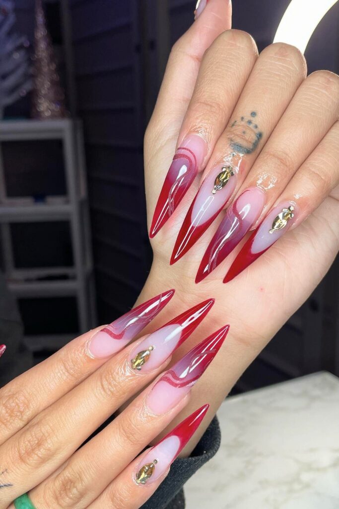Begin with a nude base, then carefully paint red polish in a French tip style, extending it into a sharp stiletto shape. Add touches of gold embellishments near the cuticle to infuse a hint of luxury.