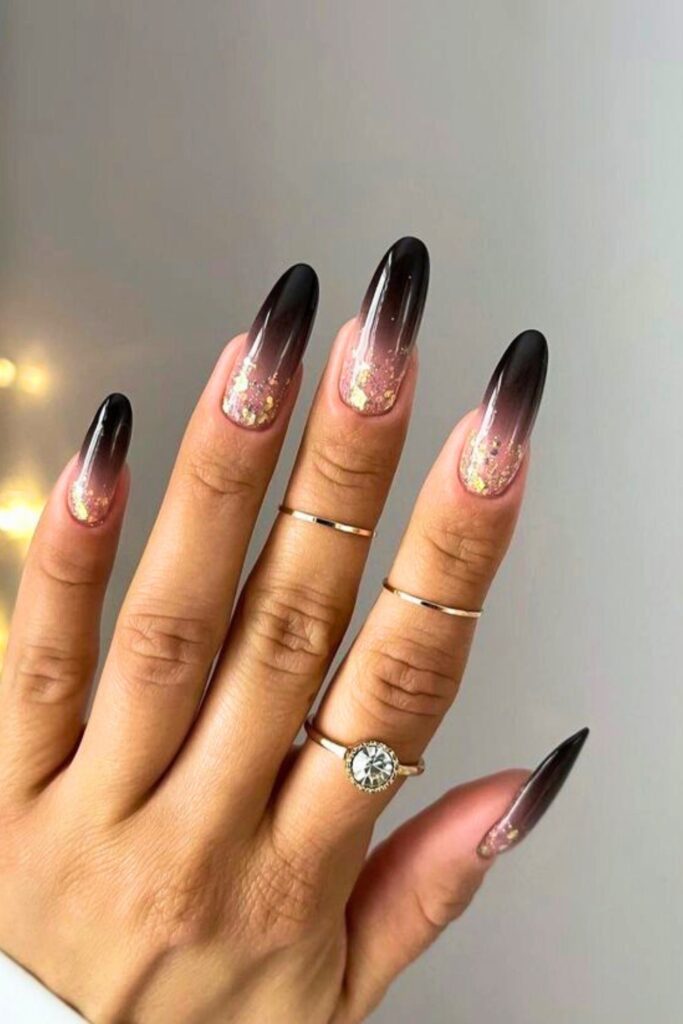 Elevate your New Year’s look with a black-to-gold ombre design that seamlessly blends elegance with sparkle.