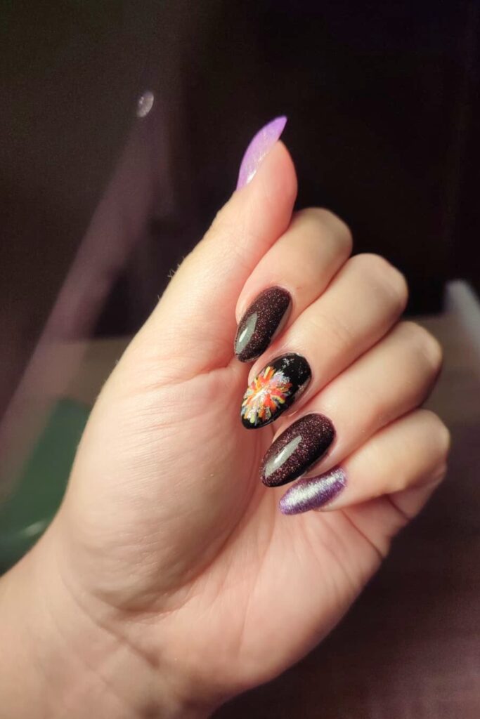 Capture the essence of midnight celebrations with firework-inspired nail art set against a dark base. This design is lively and fun, making it ideal for New Year’s Eve festivities.