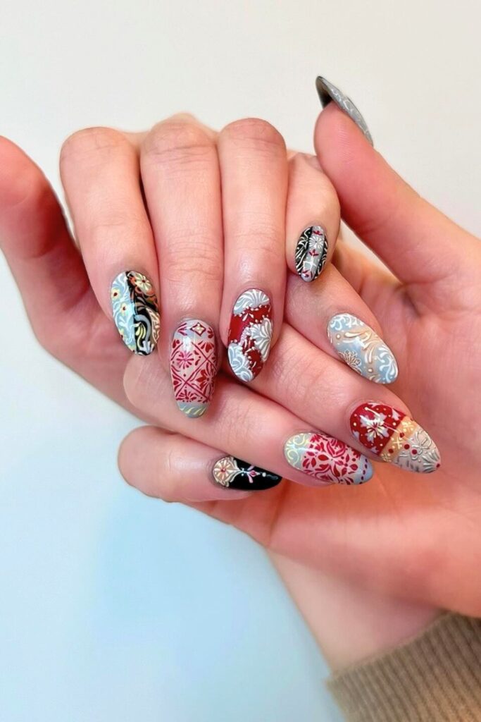 Start with a silver or red base, then use a fine brush to intricately add the patterns in contrasting hues. Finish with a glossy topcoat to protect your artwork and enhance its shine.