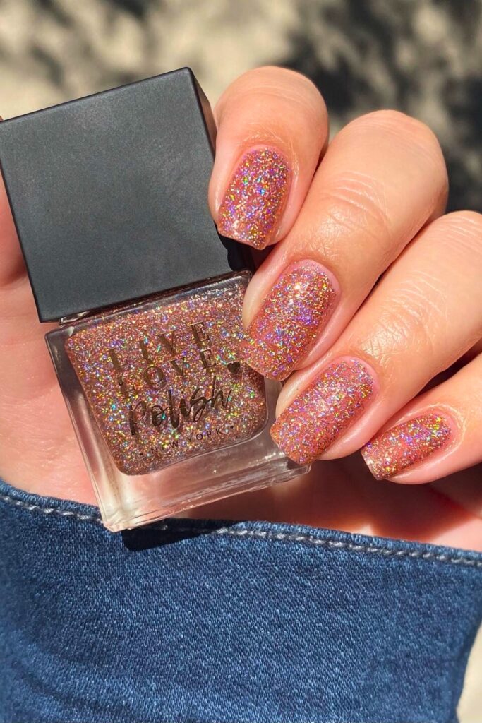 This glittery wonder is achieved by applying a rose gold glitter polish over a clear or nude base.