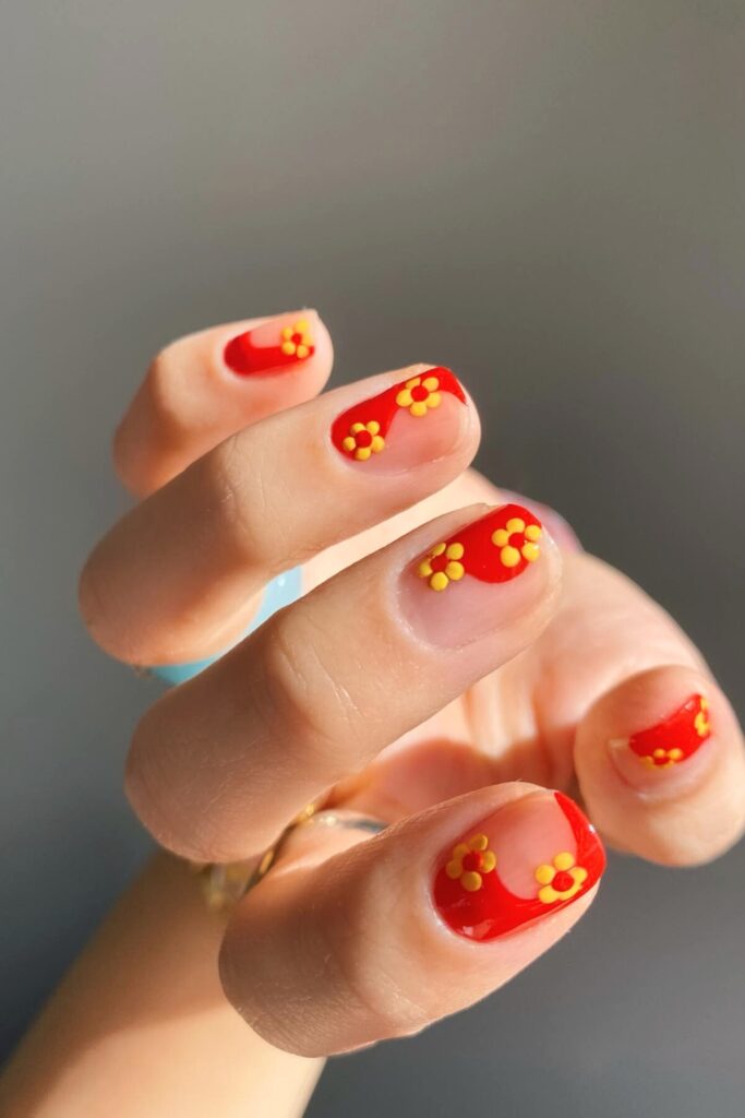Brighten up your New Year with these red nails featuring charming yellow floral accents. This design marries boldness and elegance, perfect for festive celebrations.