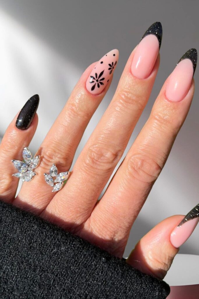 Capture sophistication with black glitter French tips on a soft nude pink base, accented by gentle floral touches. Begin with a smooth nude base, then elegantly layer black glitter on the tips.