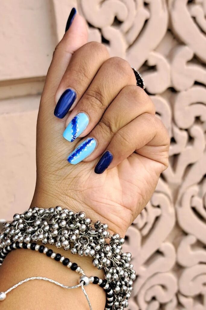 Alternate your nails between the two shades of blue, and then add a striking silver stripe down the center of each light blue nail.