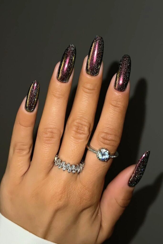 Picture a deep black or dark purple base coat that mirrors the mysterious night sky. Add a layer of glitter polish that dances between colors, twinkling under the light like distant stars.
