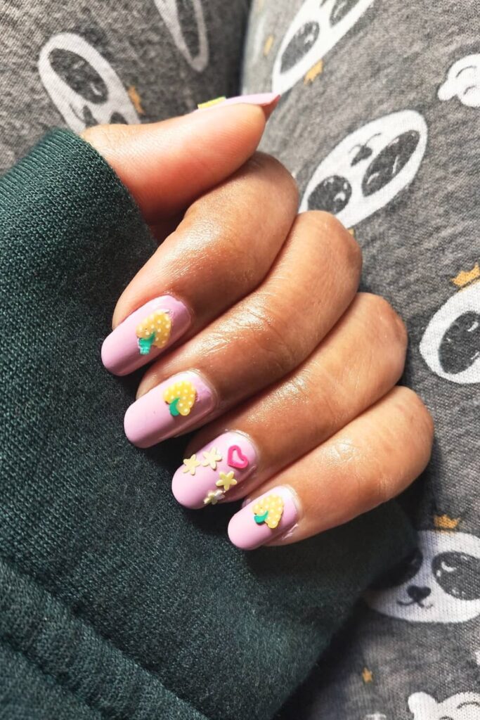 This design is both cute and creative, featuring tiny fruit shapes like strawberries and pineapples as delightful embellishments.