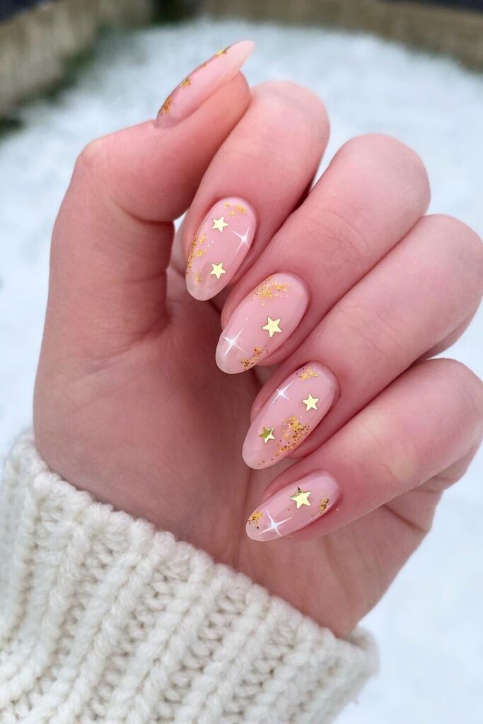 Embrace the magic of a starry night with Starry Gold Nails. Start with a sheer pink base that offers a soft, elegant appearance.