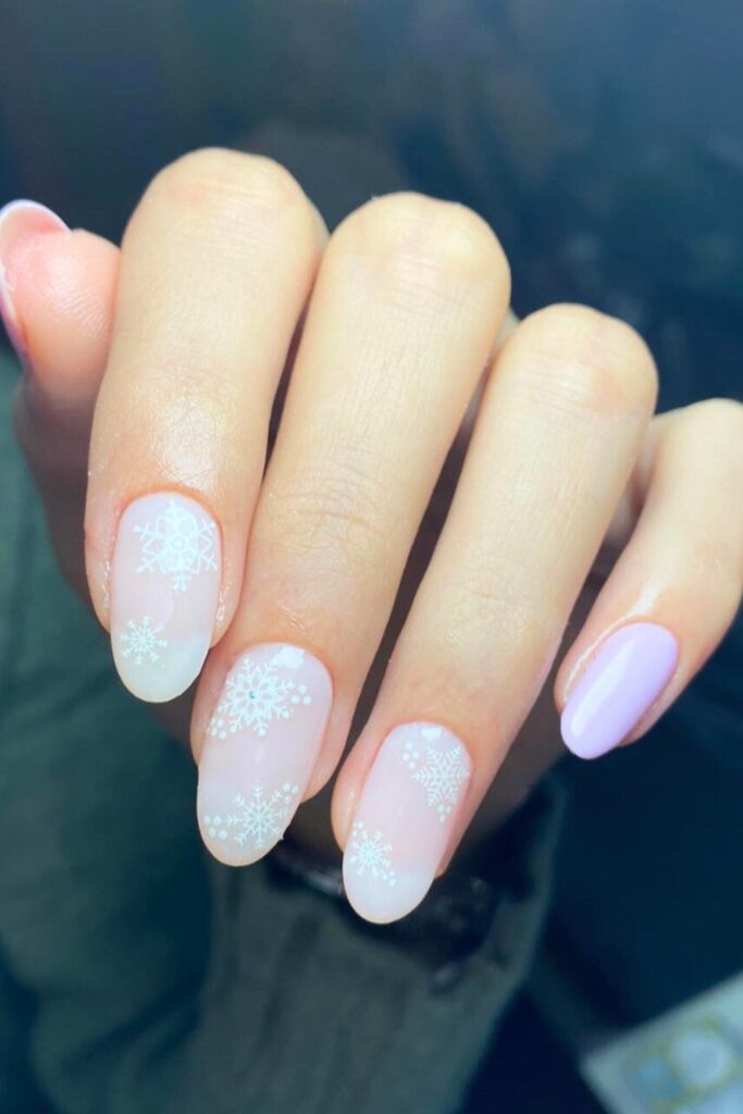 Using a white stamping plate or a fine brush, create intricate snowflake details on each nail, mimicking the beauty of freshly fallen snow.