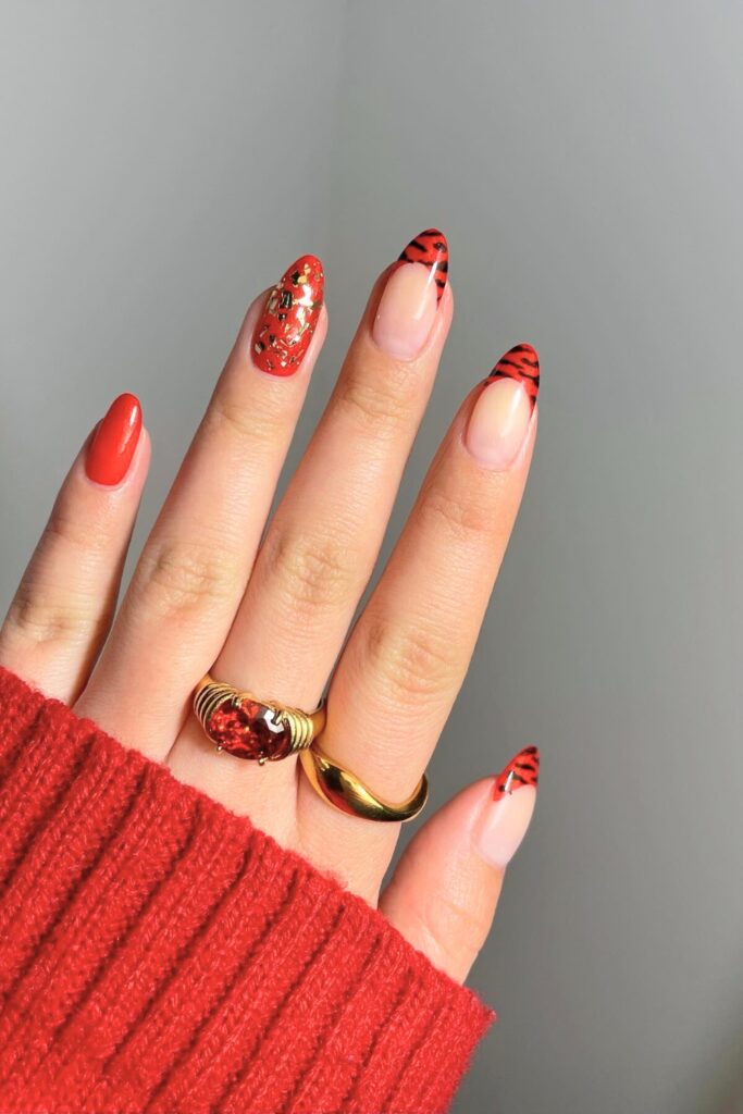 Step into the New Year with bold red and black tiger stripes on your French tips, creating a striking look perfect for any celebration.